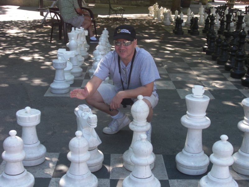 Kathy playing chess in Geneva